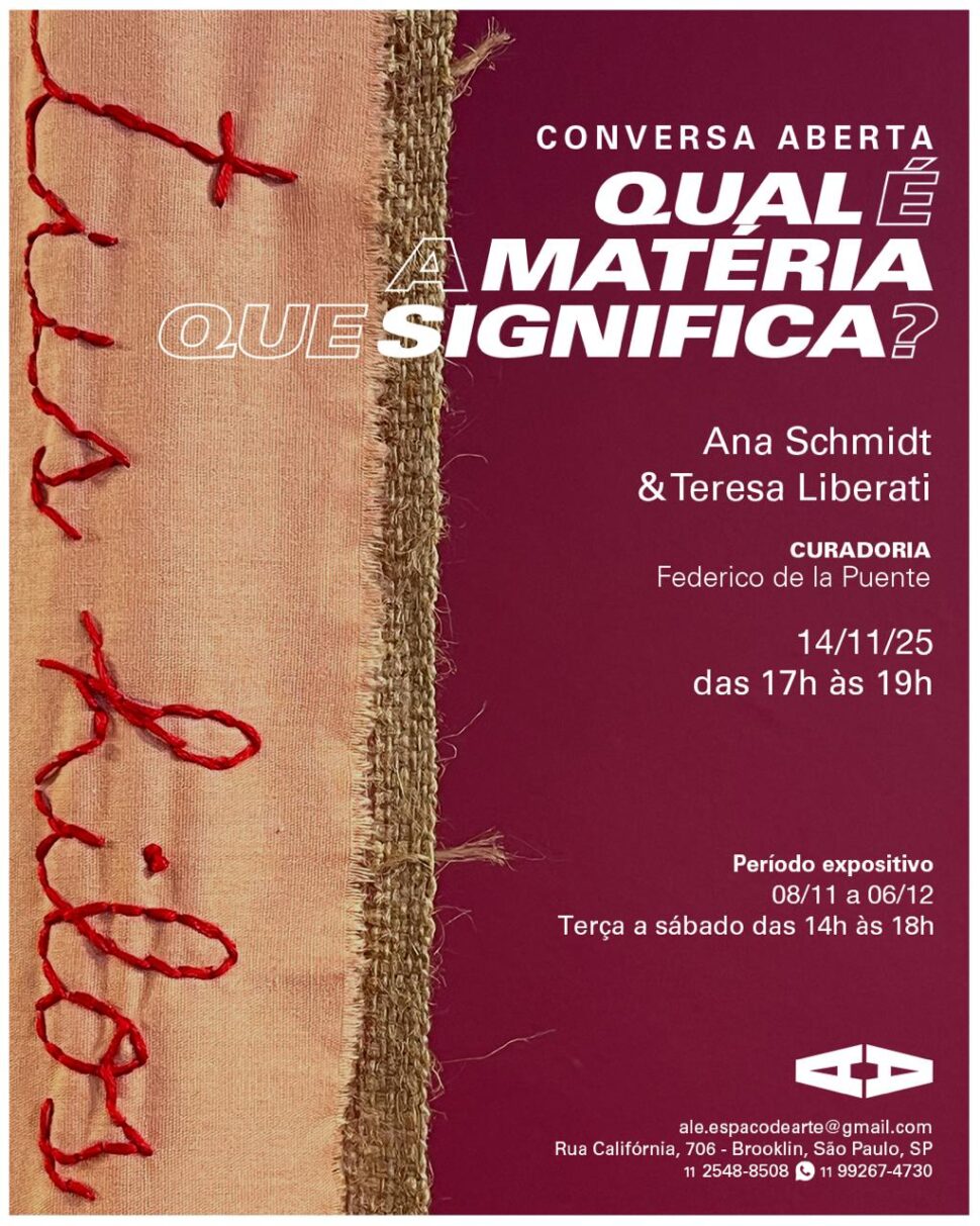 -A exposição Qual é a matéria que significa?, com curadoria de Federico de la Fuente, reúne os trabalhos das artistas Ana Schmidt e Teresa Liberati.
