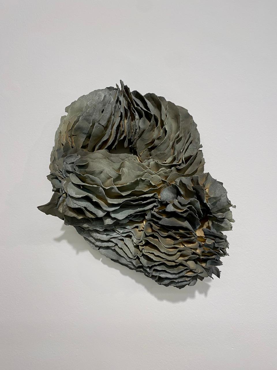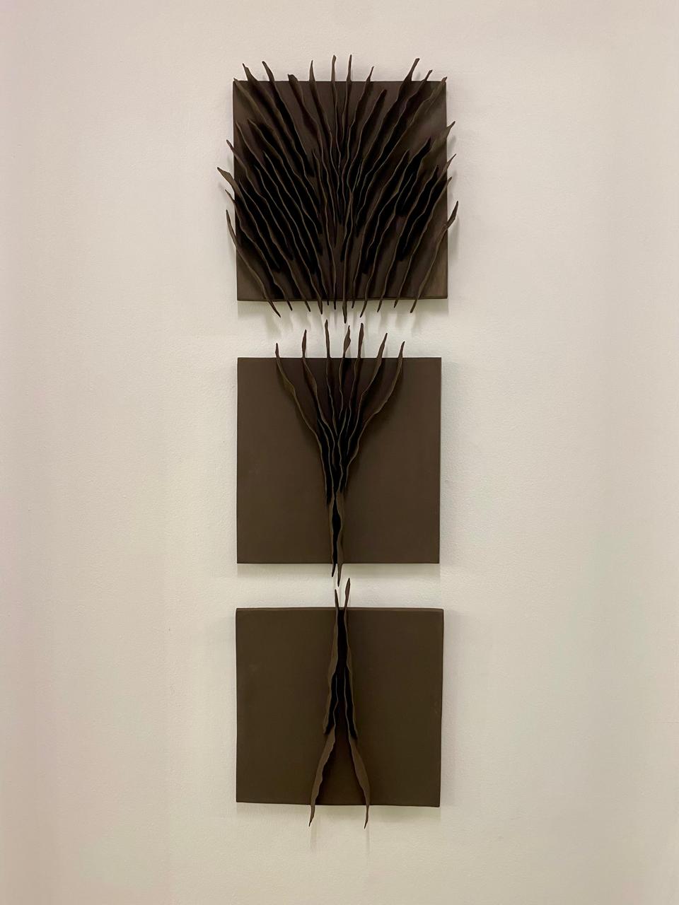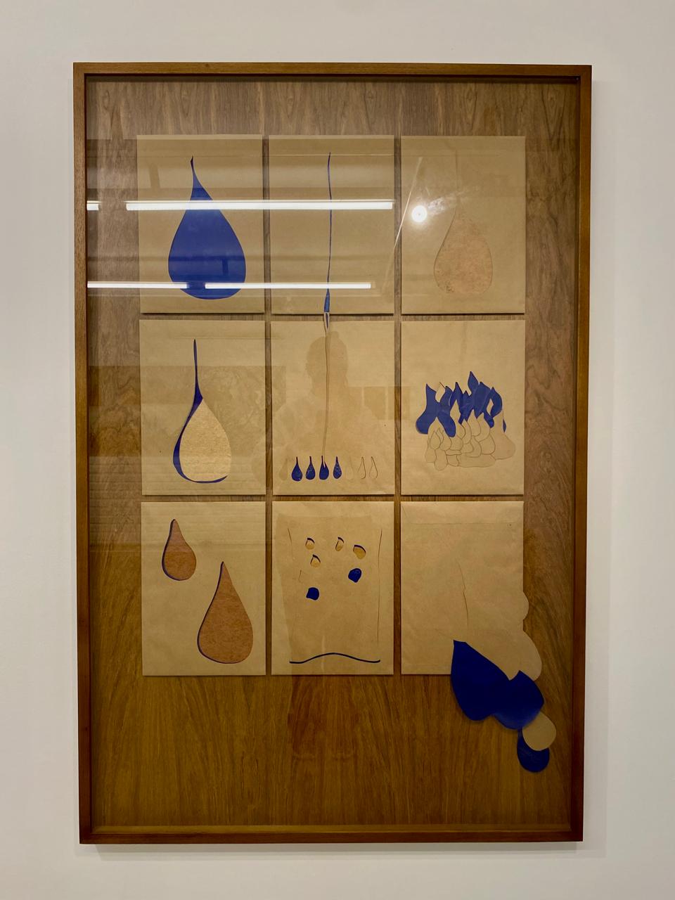 No trabalho de Ana Rey, confluem materiais naturais como madeira, papel kraft e o técnica do corte. Uma gota, várias gotas – o Desborde. O suporte, uma caixa de madeira que abriga os papéis, está ligado e colado ao seu desenho.