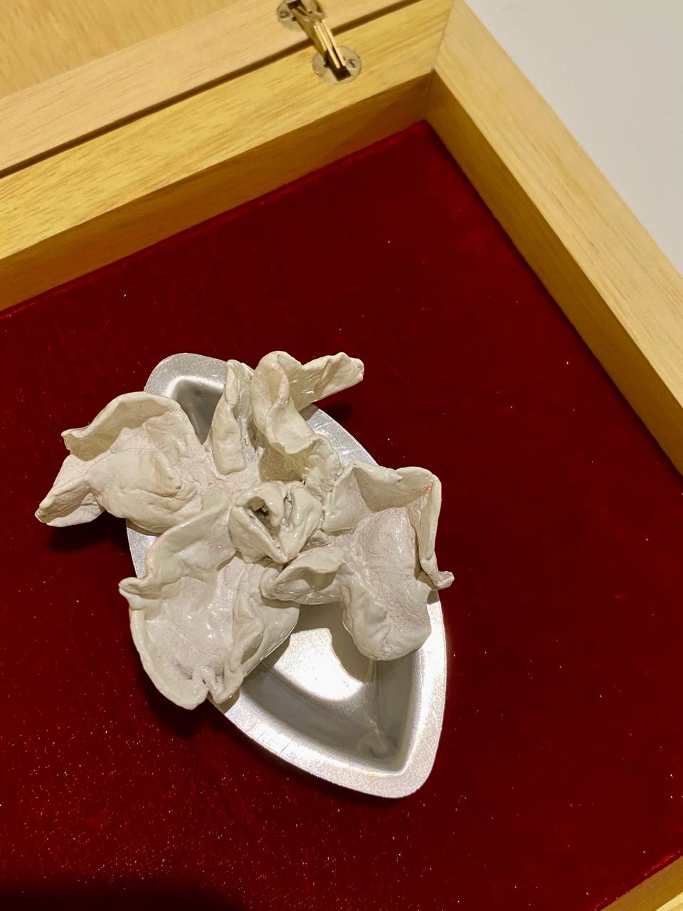Sobre a terra, na argila moldada pelas mãos de Cris Myrrha, surgem figuras envolventes, estilizadas e de extrema fragilidade. A artista explora profundamente o comportamento do material, realizando uma pesquisa de luzes, sombras, entrâncias e saliências.
